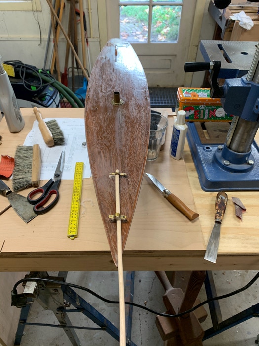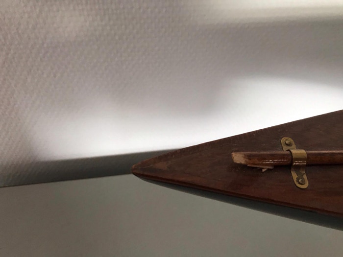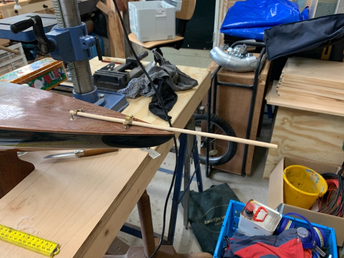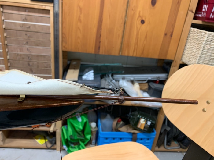 Het restaureren van de houten componenten was het eenvoudigst. Een kwestie van vervangen en lijmen. De giek heb ik gelijmd, maar omdat dit een zwakke plek blijft heb ik het verstevigd met een dunne band van koper. In het echt zie je dit ook en het verkleint de kans op een nieuwe breuk. De boegspriet is opnieuw gemaakt en ook versterkt met een ringetje van koper voor de krachten naar beneden en naar boven.