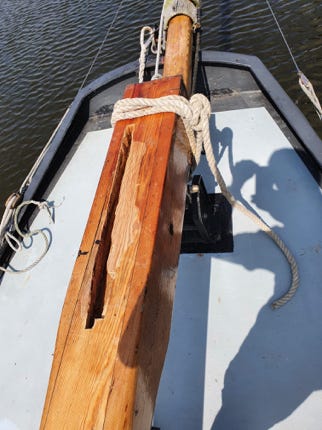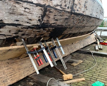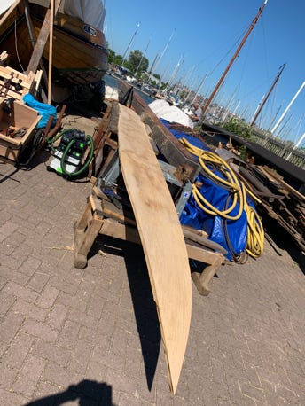 De restauratie van een houten boot. Zoeken naar krommers en rechte planken krom maken. Geweldig buiten bezig zijn met een collega.